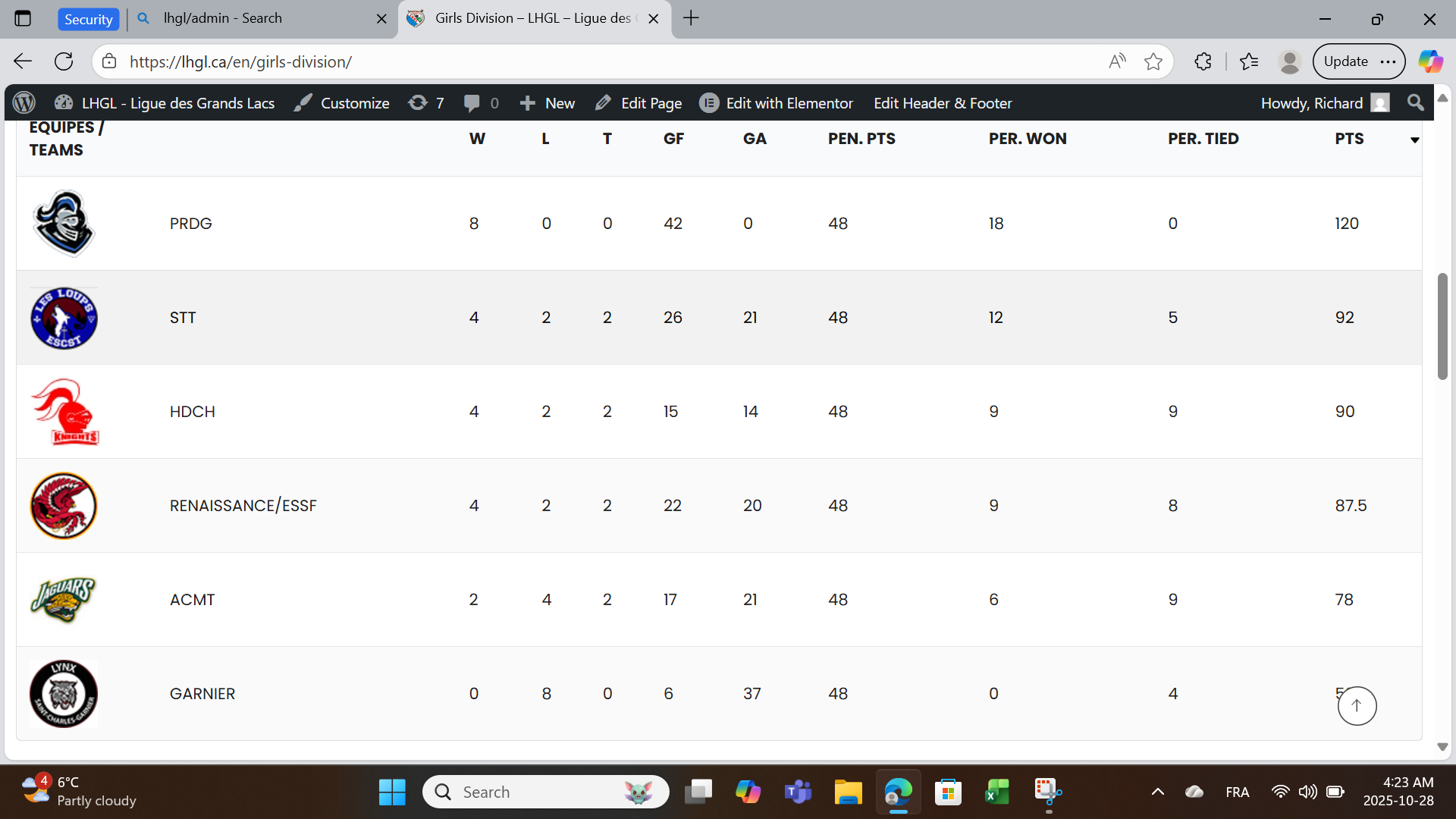 | EQUIPES FILLES/GIRLS teams | W | L | T | GF | GA | Pen pts | Per.won | Per tied | pts |
