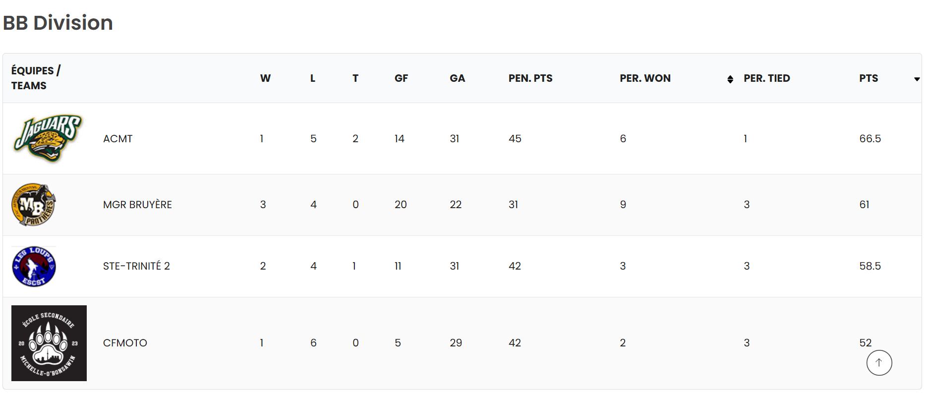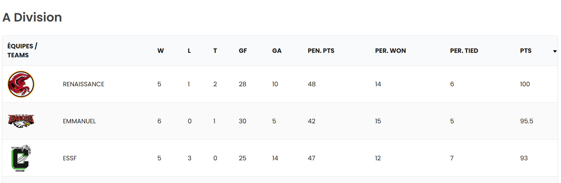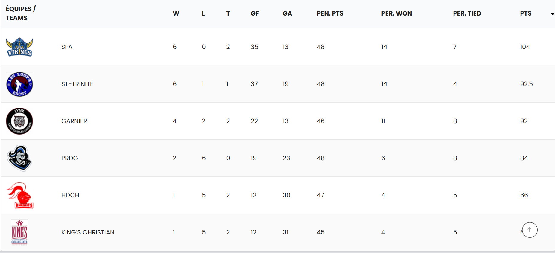 | St-Charles Garnier | 6 | 2 | 1 | 40 | 22 | 50 | 14 | 8 | 105.5 |
